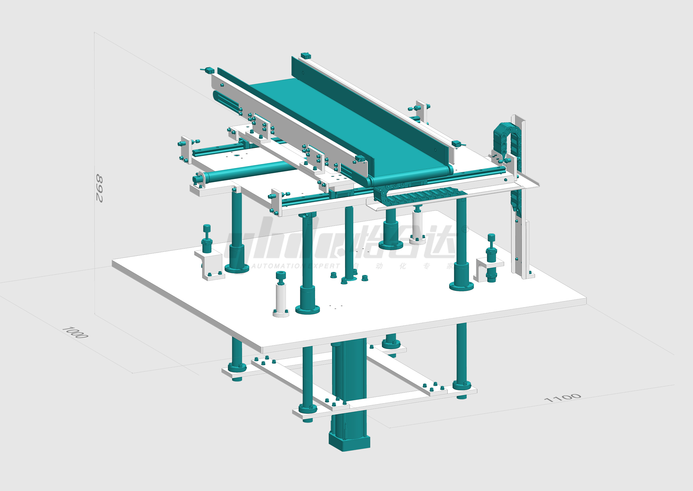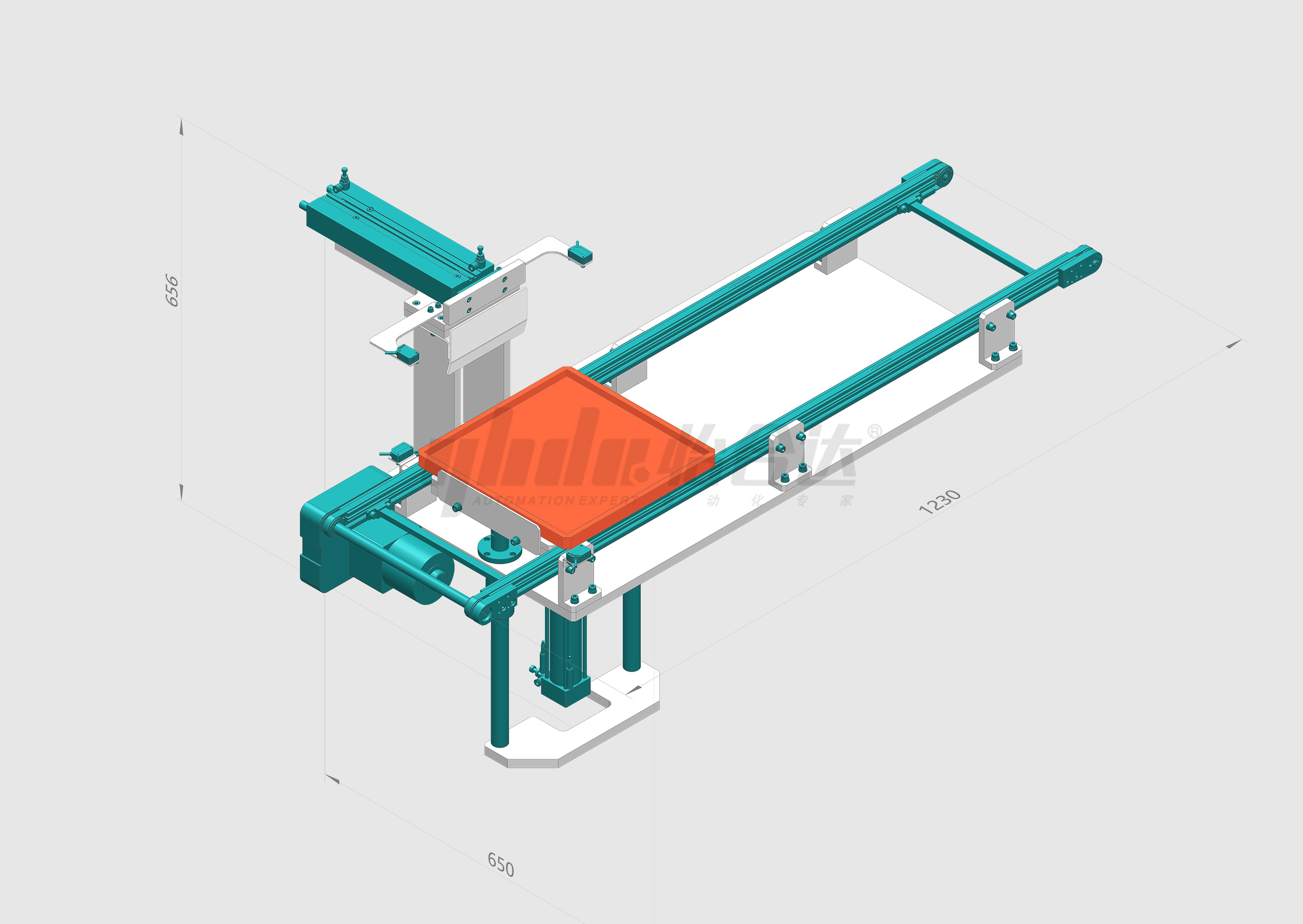 托盘在同步带输送机传送过程中,需要变换托盘传送的高度和传送的方向时,利用气缸升降实现高度变换,气缸推移实现方向变换,可以将托盘从横向传送转换到不同高度的纵向传送。适用于利用托盘装载样品的场合,例如3C,电子,食品等行业