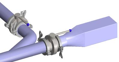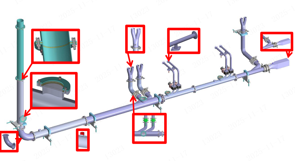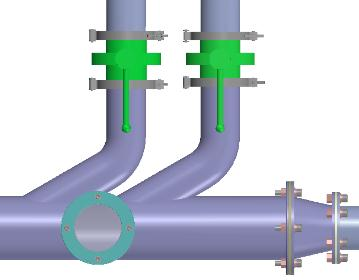 | 5、管道汇合处设计要点 a.禁止使用直角汇合,使用45度角; b.汇合处管道内壁必须打磨光滑; c.选择标准弯头尺寸,保证圆角过渡; d.变径选择标准变径尺寸,长度要合理,保证有足够的扳手位置; e.手动蝶阀处双向均为标准DN快换接头,按规格选取,并做注释; f.手动蝶阀下单时,要同时下单密封垫; g.卡夹按标准规格选型。 |