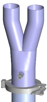 | 6、一分二Y型接头设计要点 a.汇合处管道内壁须光滑,无明显凸起; b.大端为标准DN快换接头,按规格选取,并做注释; c.两小端管可以用标准直管折弯,但折弯处圆度要控制在10%以内; d.密封垫下单; e.卡夹按标准规格选型。 |