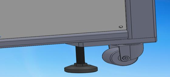 1)要求脚轮旋转 360 度和脚杯没有干涉,脚轮和脚杯之间的距离尽量大些,方便调节脚杯; 2)脚轮要求两个万向,两个带刹车; 3)脚轮和脚杯的负载一定要达到 2 倍以上; 4)脚杯的安装孔一定要求和机架垂直; 5)设备底部离地面高度:120+/-30mm; |