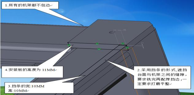 1)所有机架都不包边; 2)采用挡条的形式,遮挡台面与机架之间的缝隙,要求铣完再配焊挡边,一定要求打磨平整; 3)安装板的高度为11mm,挡边的高度为10mm,挡边的宽度为10mm; |