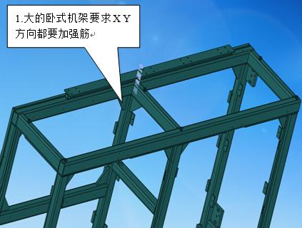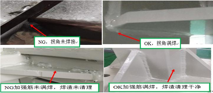 1)大的卧式机架要求 X Y 方向都要加强筋; 2)要求振动时效去应力处理,所有满焊到位以后做去应力(不锈钢机架); 3) 方通要求四周全部满焊; 4)焊点打磨光滑,不能有黑印,要酸洗去黑点; |