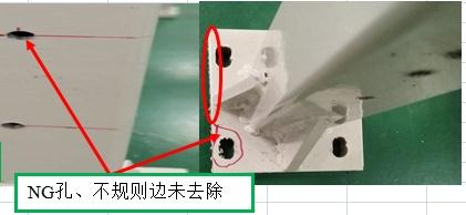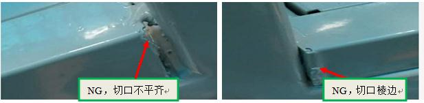 1)切口端面不得有撕裂、裂纹、棱边、不平齐以及影响组立尺寸精度的毛刺; 2)零件外形不得有熔渣、毛刺、不规则边; |
