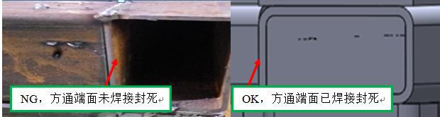 所有漏在外侧的方通面,必须用钢板满焊封死,并打磨光滑; | ||