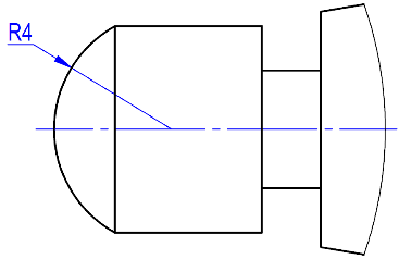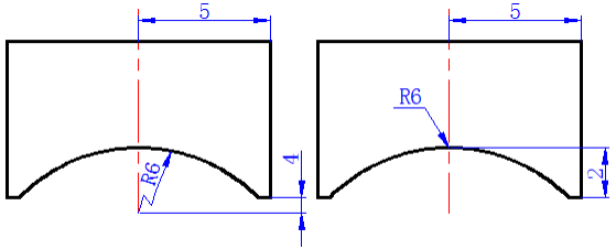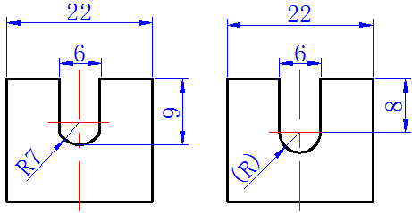 ①若半径不等于槽宽之半,应注出半径尺寸; ②若半径等于槽宽之半,根据具体要求可不注半径尺寸,也可将其作为参考尺寸注出,或只注符号 R 而不注尺寸数字。 |
