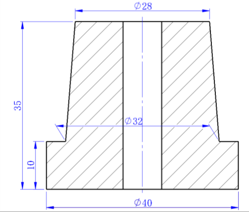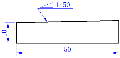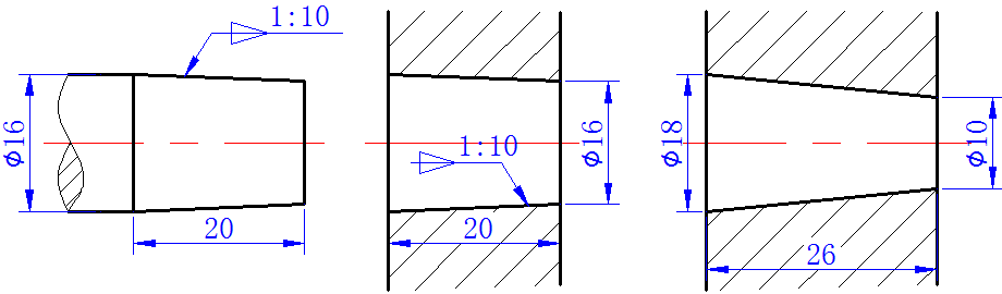 外锥面注大端直径、锥度、长度;内锥面注小端直径、锥度、长度;锥度较大时,应注出大、小端直径及长度。其中,1:10 是指斜面高度与长度的比例。 | |