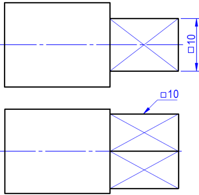 用细实线绘制,符号为正方形,可标注在单个边长的尺寸前面,也可引出标注在数字前面,如左图所示。 | |