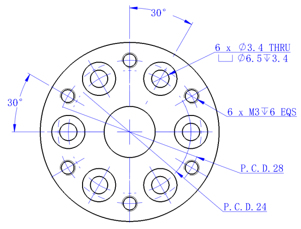 EQS:均布, P.C.D.:中心节圆直径 角度标注:数字水平 通孔标注:“通或者贯穿” |