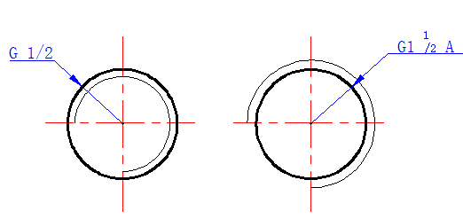 螺纹代号 公称直径(in)(公差等级)螺纹代号: 非螺纹密封的圆柱内管螺纹G;非螺纹密封的圆柱外管螺纹G1;螺纹密封的圆柱内管螺纹Rp1,与之配合的圆锥外螺纹R1;螺纹密封圆锥内管螺纹 Rc1,与之配合的圆锥外管螺纹R2 |