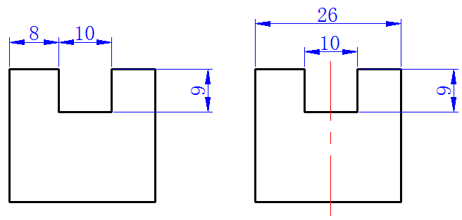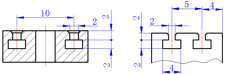 ①当以一个侧面为基准时,只需标槽宽、槽深以及定位尺寸; ②当槽的位置要求对称时,应以对称中心平面为基准注出对称尺寸。 |