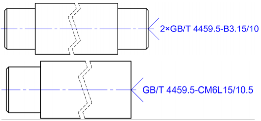 “2×”表示两端各一个中心孔,GB/T 4459.5-B3.15/10 是指采用B 型中心孔, D=3.15mm ,D1=10mm;GB/T 4459.5-CM6L15/10.5 是指采用 C 型带螺纹的中心孔,D=M6,L=15mm,D1=10.5mm | |