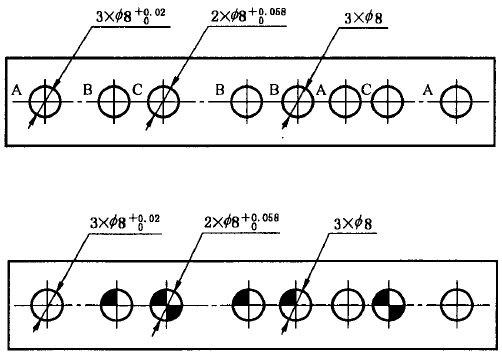 在同一图形中,如有几种尺寸数值相近而又重复的要素(如孔等)时,可采用标记(如涂色等)或用标注字母的方法来区分。 | |