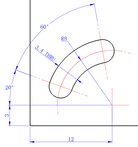 标注腰形孔中心圆半径和槽宽及定位角度和形状角度。 角度标注:数字水平 |